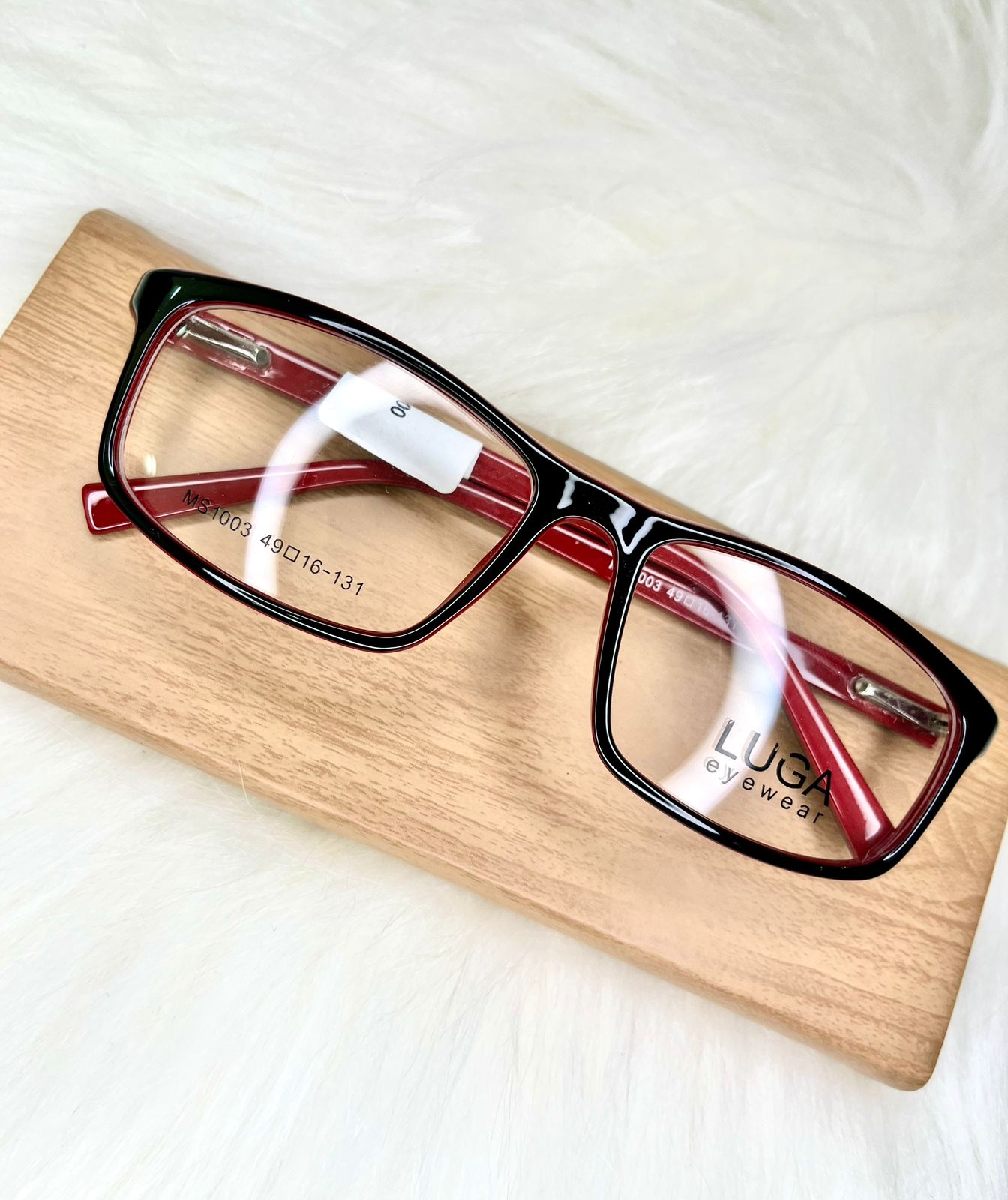 Armação masculina infantil, em acetato, com a coloração preta e com detalhe em vermelho na parte de dentro da armação. É uma peça leve e confortável. REF.: MS1003, TAM.: 49