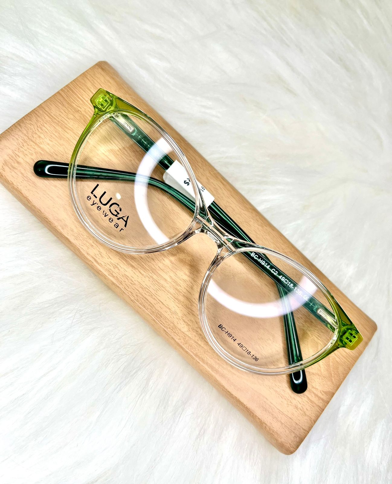 Armação feminina infantil, em acetato, na coloração branco transparente com detalhes em verde com transparência. É uma peça leve e confortável. REF.: BC-H914, TAM.: 49.