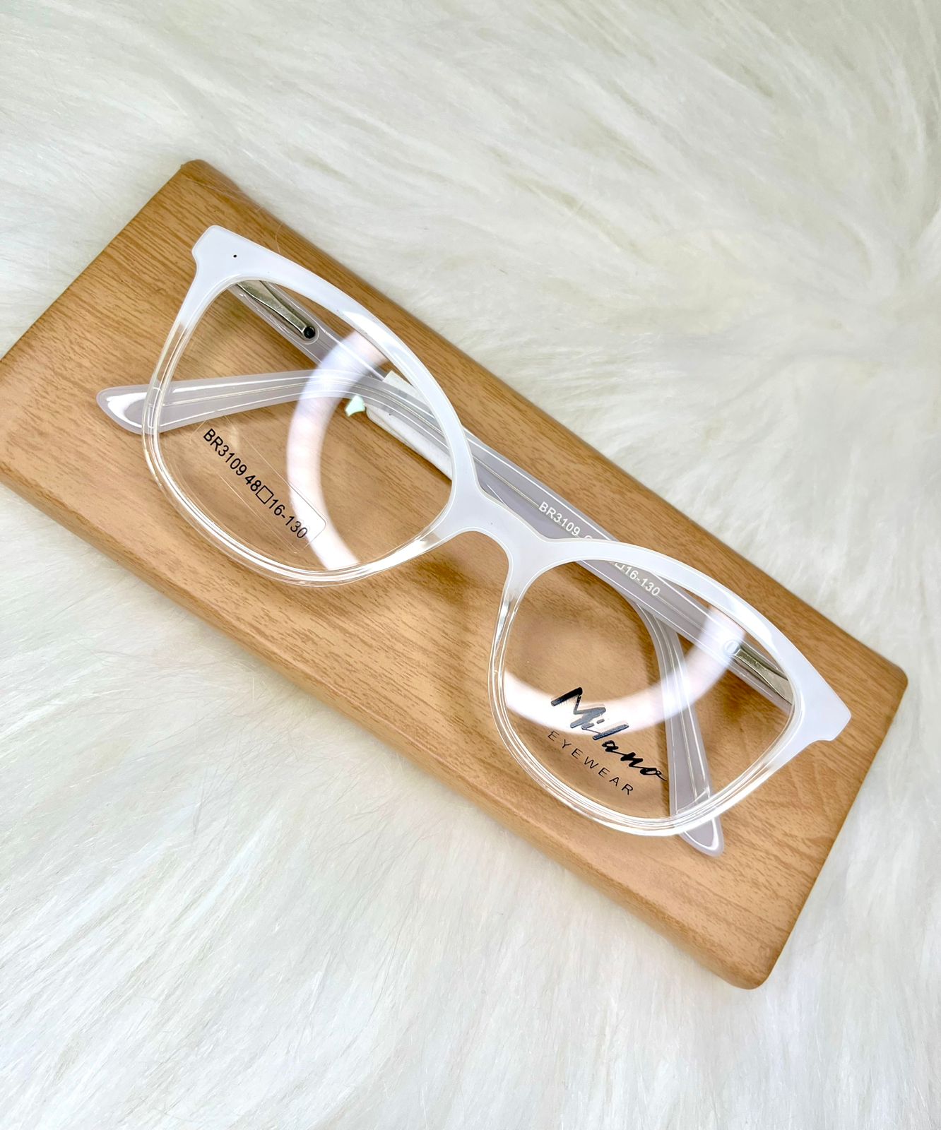 Armação feminina infantil, em acetato, na coloração em branco fosco com degradê para o transparente e nas hastes na cor branco com transparência. É uma peça leve e confortável. REF.: BR3109, TAM.: 48.