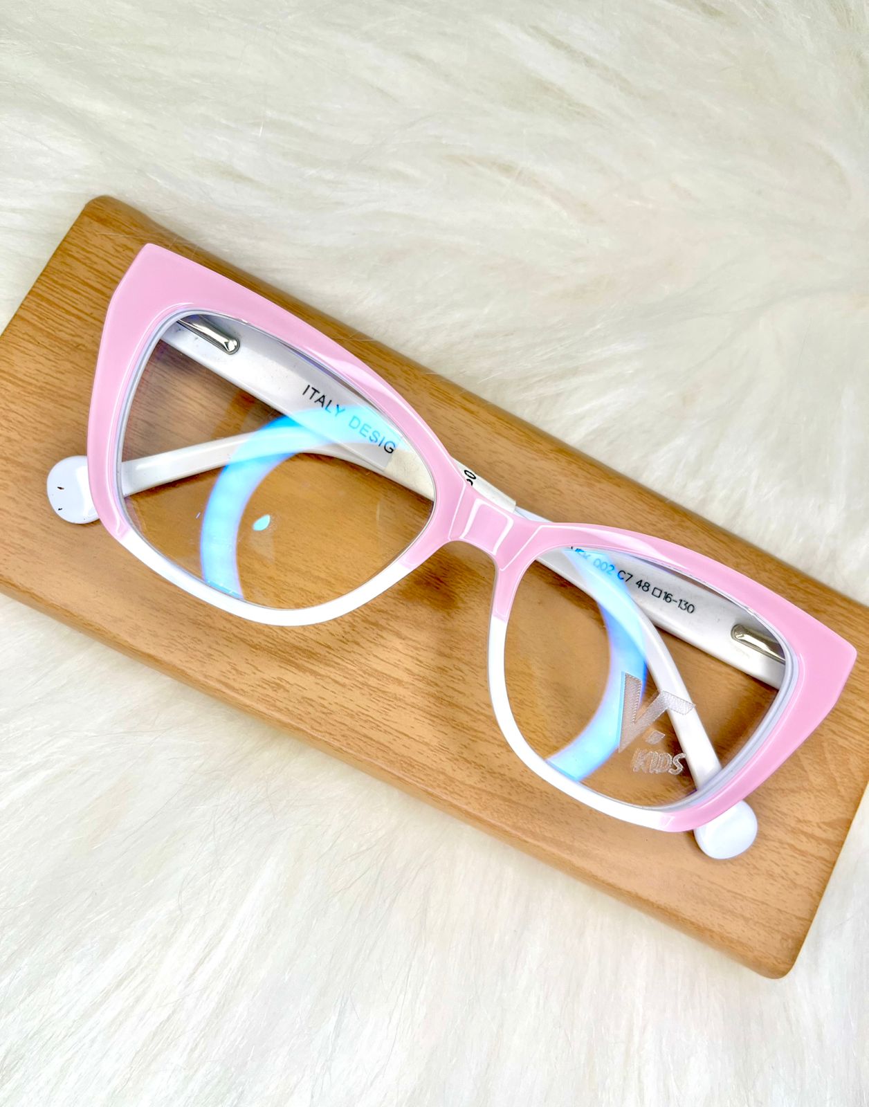 Armação infantil, em acetato, na coloração branco com detalhes em rosa, hastes na cor rosa e com a parte de dentro em branco. É uma peça leve e confortável. REF.: VFK002, TAM.: 48.