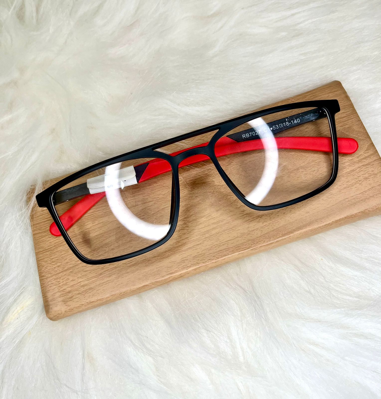 Armação em acetato, modelo jovial masculina, na cor preta, com ponteiras na cor vermelha. É uma peça leve e confortável. REF.: RB7027, TAM.: 53.
