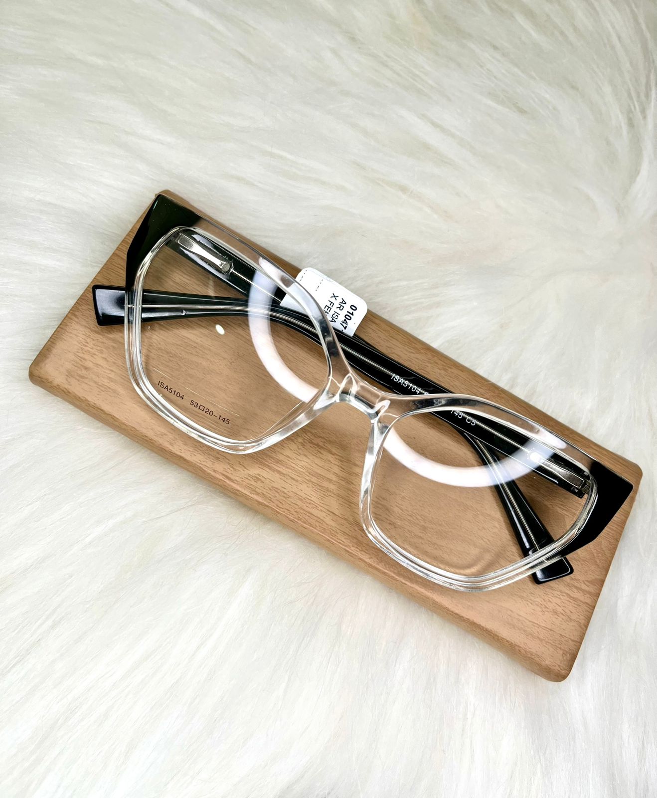 Armação feminina em acetato, modelo jovial, na coloração transparente com detalhes em preto e hastes na cor preta. É uma peça leve e confortável. REF.: ISA5104, TAM.: 53.