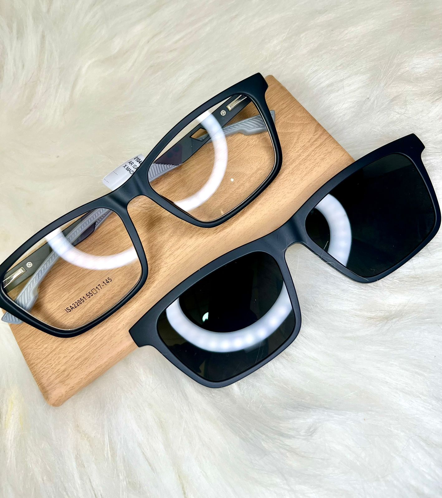 Armação em acetato masculina com clipon, peça na coloração preta com detalhes na hastes em cinza e um modelo jovial. É uma peça leve e confortável. REF.: ISA22051, TAM.: 55.