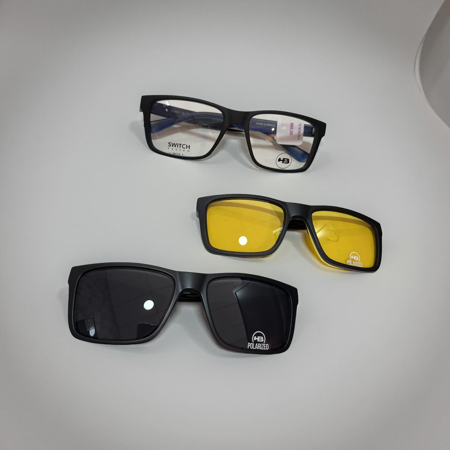 ARMAÇAO EM ACETATO TRADICIONAL. NA COR PRETO FOSCO COM HASTES AZULADA , ACOMPANHA UM CLIPON NIGTH VISION POLARIZADO, E UM CLIPON SOLAR POLARIZADO.