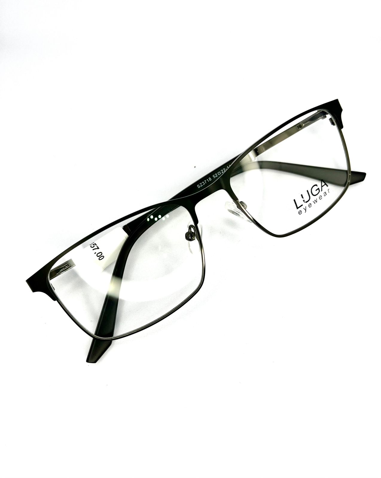 Armação masculina em metal, modelo quadrado e jovial. Na coloração preta e com detalhes na cor grafite. É uma peça leve e confortável. TAM.: 52, REF.: SZ3718.
