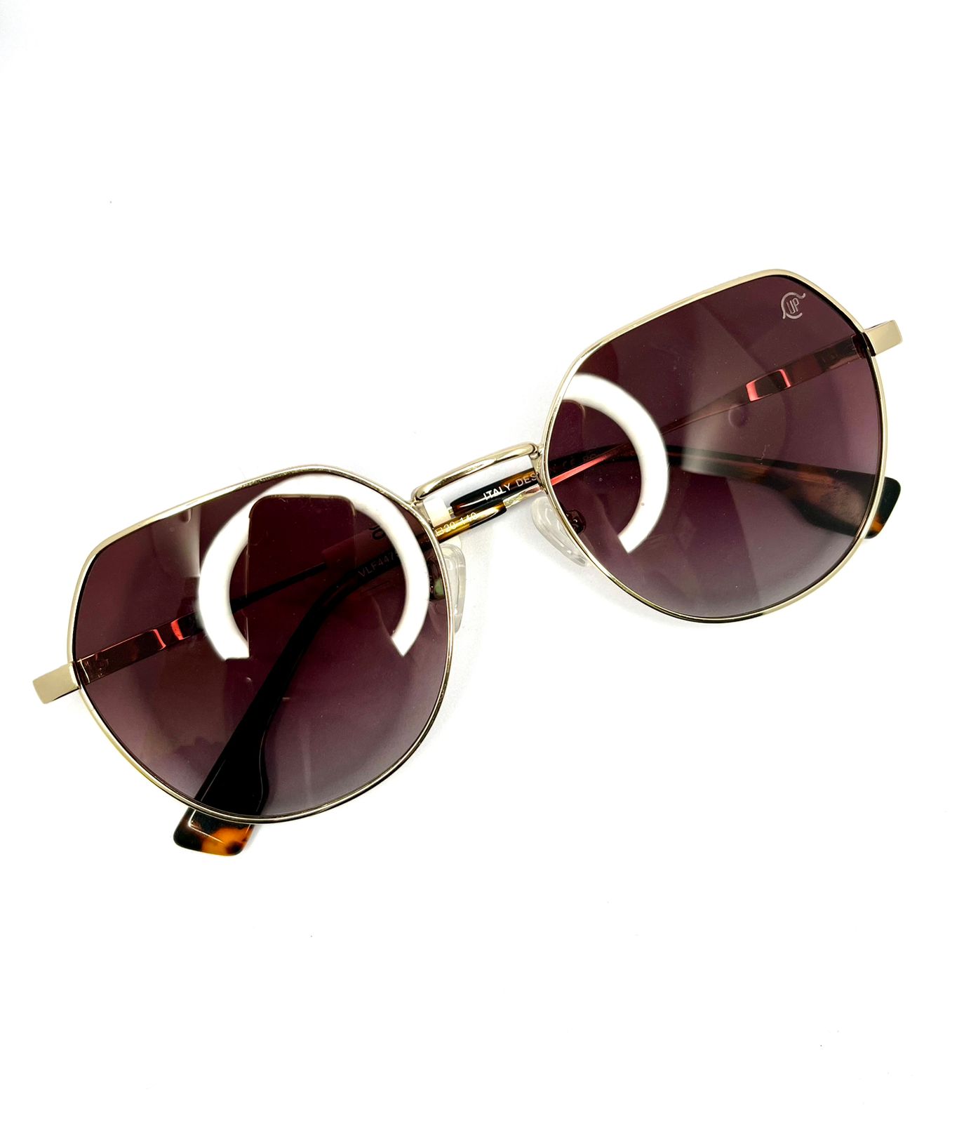 Óculos de sol feminino, modelo jovial e em metal. Na coloração em dourado e com as ponteiras em oncinha nos tons de marrom com preto. Lentes na coloração marrom com degradê. É uma peça leve e confortável. TAM.: 54, REF.: VLF4475.