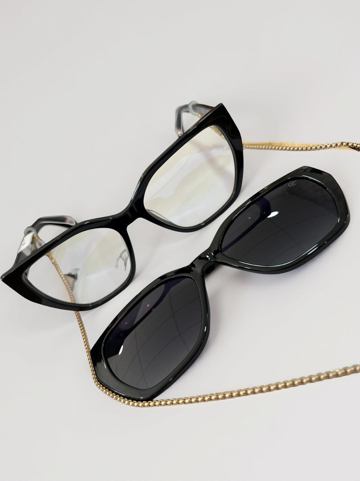 ARMAÇAO EM ACETATO , NA COR PRETA , ACOMPANHA CLIPON POLARIZADO, E ACOMPANHA CORRENTINHA.