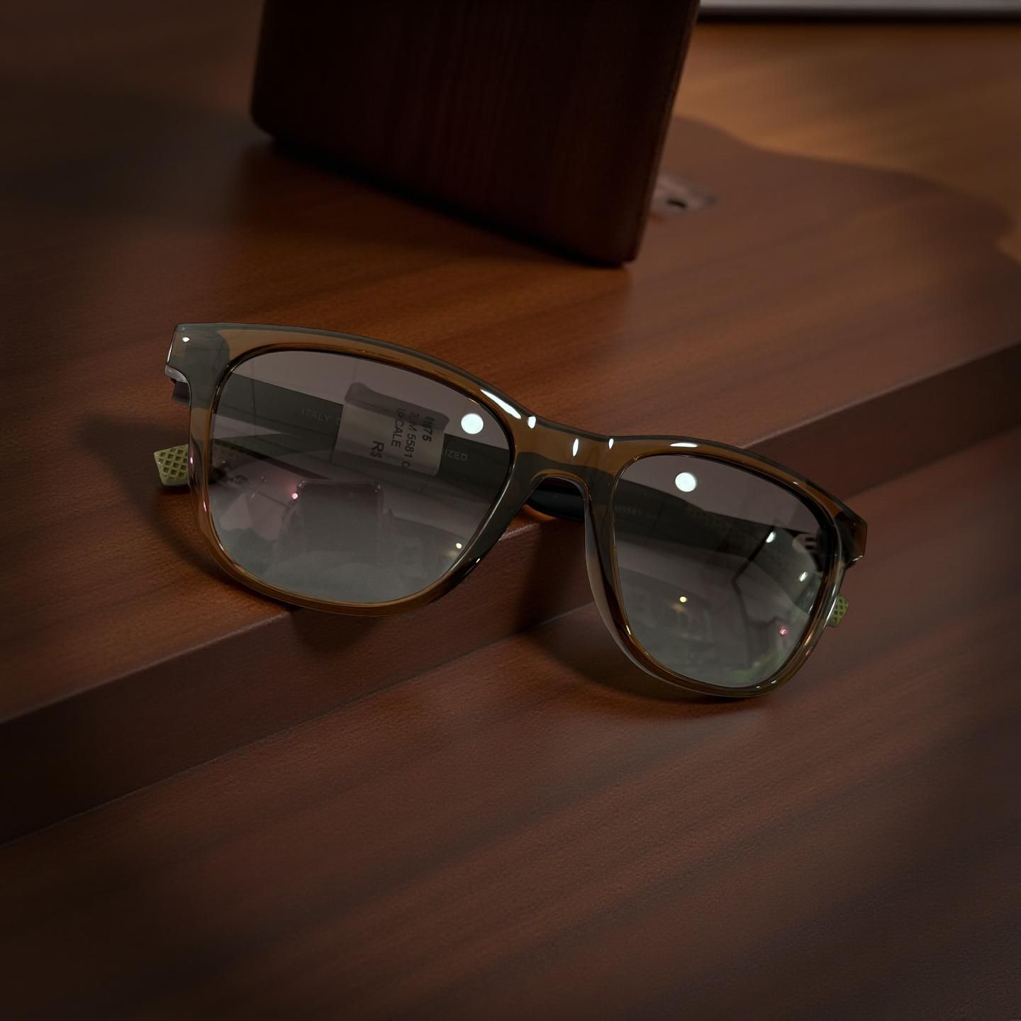 OCULOS DE SOL EM ACETATO , NA COR CARAMELO , COM LENTES ESCURAS EM DEGRADE E POLARIZADAS.